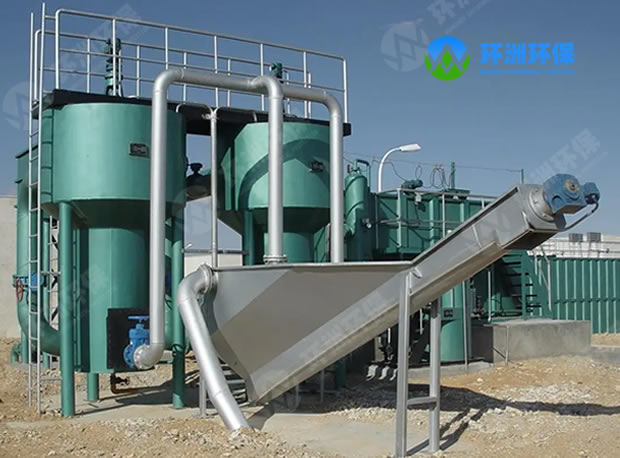 旋流沉砂池采用锥底圆形池,在池内设有桨叶分离机,在污水从池的切向入流,回旋270°后(按俯视顺时针向),从排放渠排出,利用进水的一定流速作为动力,沿圆形沉砂池的内壁作切线运动,形成旋流,同时通过桨叶搅拌,使液体旋流和轴向涡流,从而加速污水中砂粒沉降,让水中有机物与砂粒有效地分离,同时还利用越靠中心水流断面越小,水流速度加快,底部水流速度向心递增的原理,将池底的沉砂以螺旋状轨迹向中心砂斗移动。有机物在池中心部向上升起,并随出水水流一并排出,底部沉砂经提升装置提升,进入砂水分离器进行砂水分离后,污水则回流至格栅井内。